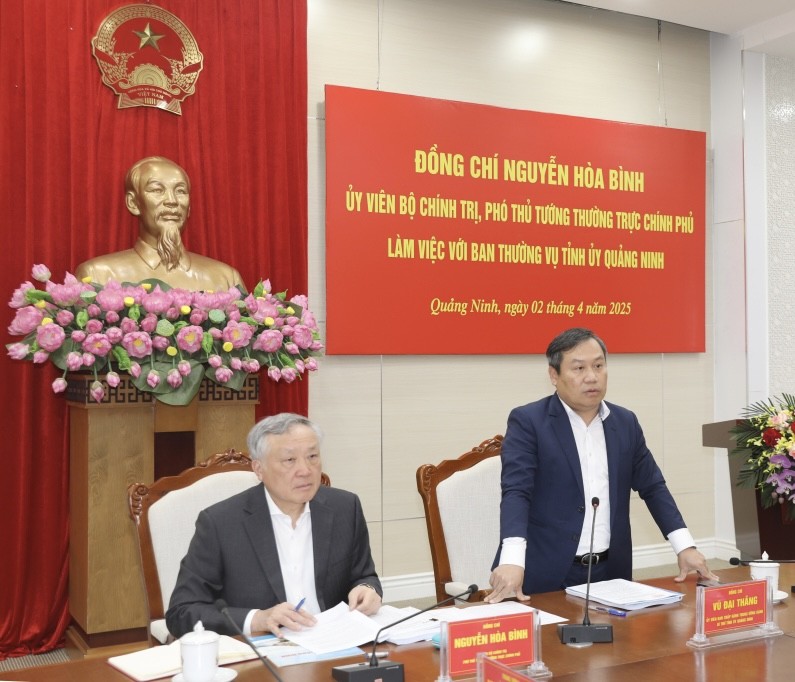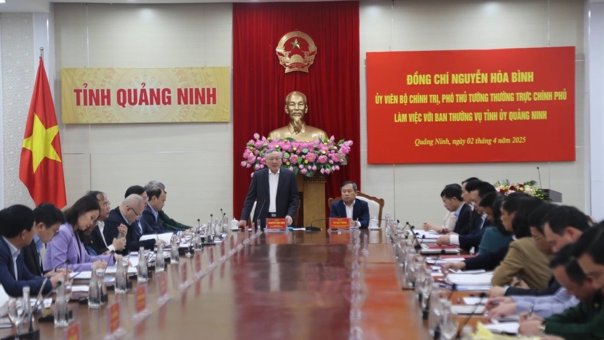 Chiều 2/4, Đoàn công tác Chính phủ do ông Nguyễn Hòa Bình, Ủy viên Bộ Chính trị, Bí thư Trung ương Đảng, Phó Thủ tướng Thường trực Chính phủ làm việc với Ban Thường vụ Tỉnh ủy Quảng Ninh về tình hình thực hiện các giải pháp thúc đẩy sản xuất kinh doanh, đầu tư công, xuất nhập khẩu, các chương trình mục tiêu quốc gia, phấn đấu đạt và vượt mục tiêu tăng trưởng năm 2025.