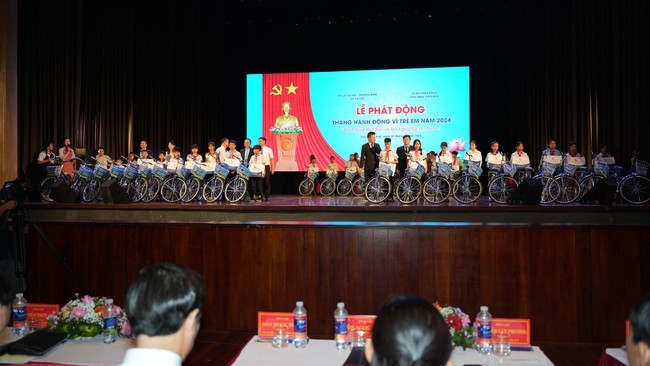 Trao tặng xe đạp cho trẻ em có hoàn cảnh đặc biệt tại Lễ phát động Tháng hành động vì trẻ em năm 2024 (Ảnh: MH) |