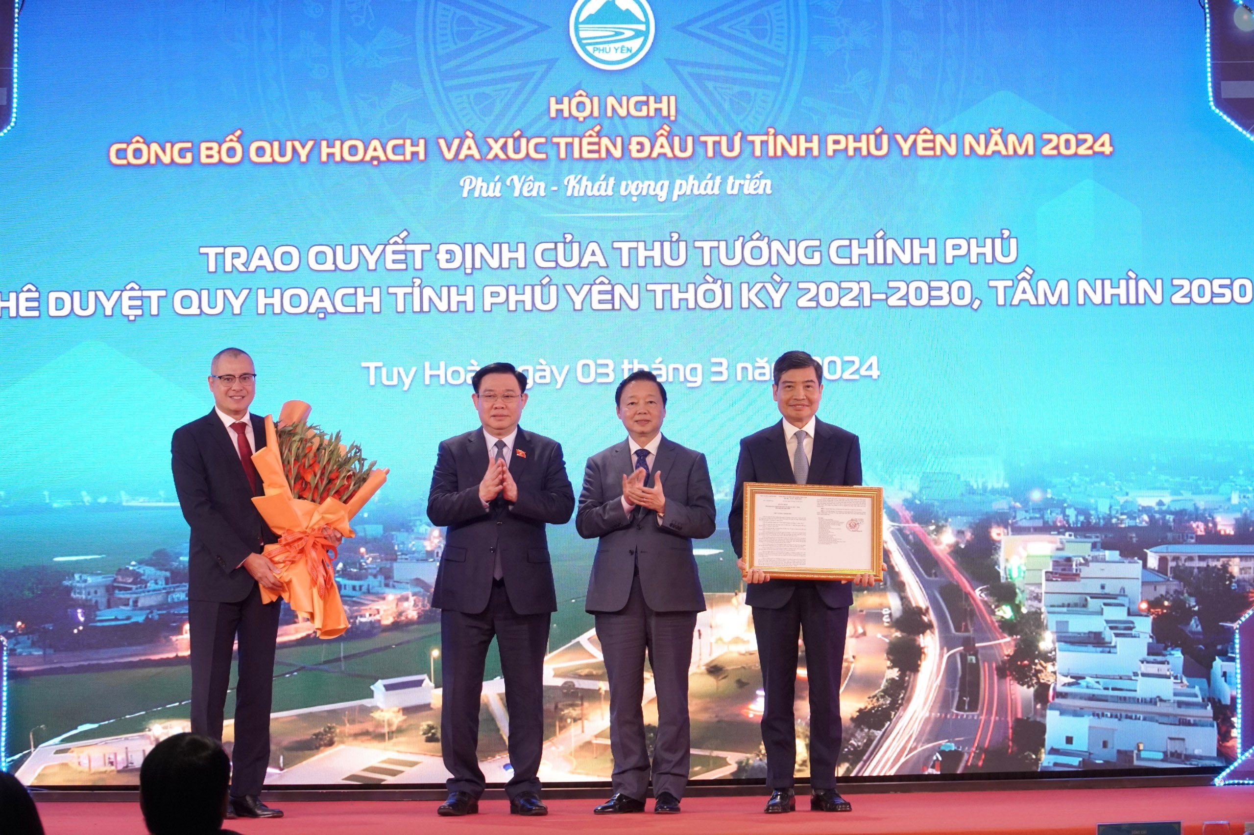 Sáng 3/3, UBND tỉnh Phú Yên tổ chức dự Hội nghị công bố Quy hoạch tỉnh thời kỳ 2021 - 2030, tầm nhìn đến năm 2050 và xúc tiến đầu tư tỉnh năm 2024. Đến dự có Chủ tịch Quốc hội Vương Đình Huệ, Phó Thủ tướng Chính phủ Trần Hồng Hà và lãnh đạo các cơ quan Trung ương.