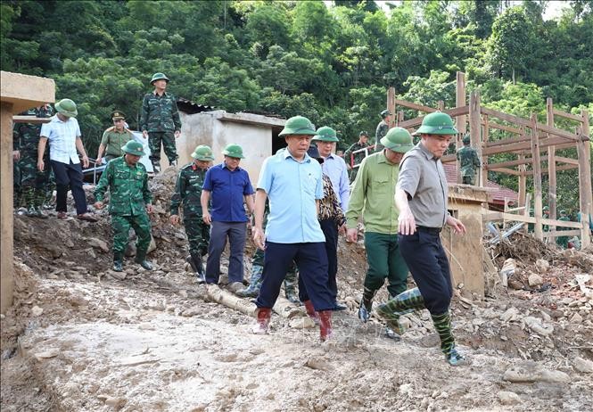 | Phó Thủ tướng Trần Lưu Quang cùng đoàn công tác kiểm tra công tác khắc phục hậu quả lũ quét tại bản Lĩnh, xã Mường Pồn, huyện Điện Biên, tỉnh Điện Biên. Ảnh TTXVN |