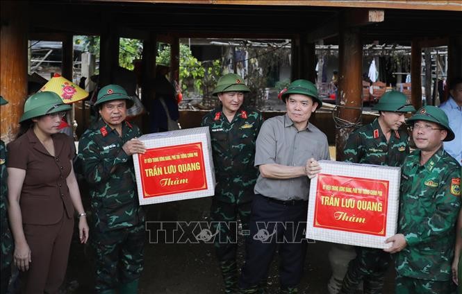 | Phó Thủ tướng Trần Lưu Quang thăm hỏi, động viên và tặng quà các lực lượng tham gia khắc phục hậu quả lũ quét tại bản Lĩnh, xã Mường Pồn, huyện Điện Biên, tỉnh Điện Biên. Ảnh: TTXVN |