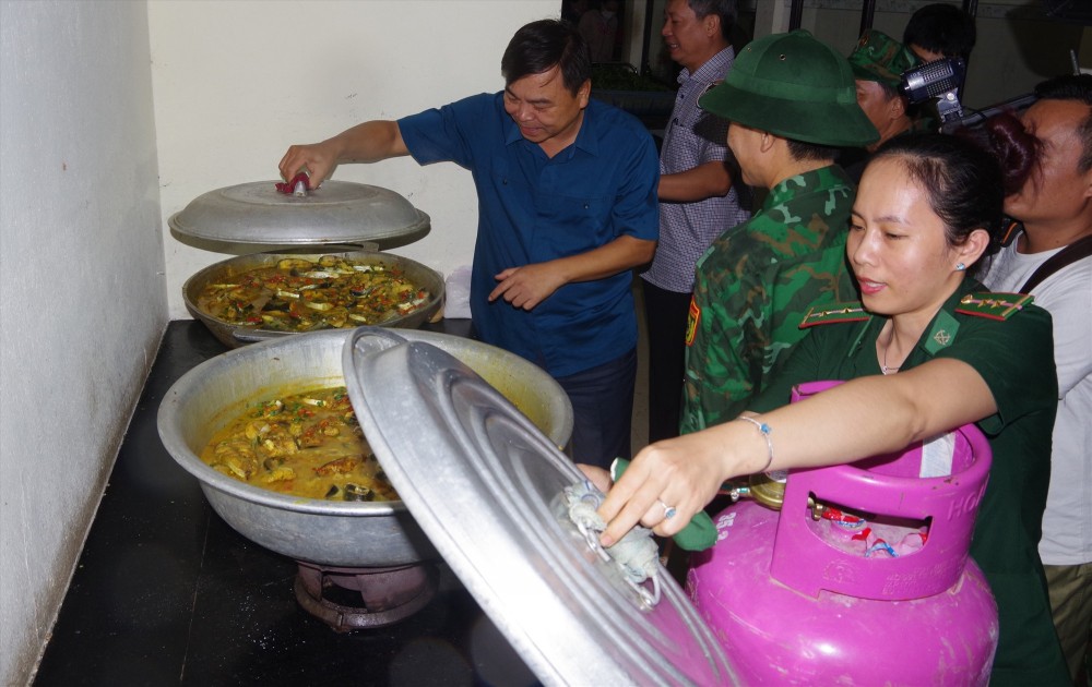 | Phó trưởng Ban chỉ đạo Quốc gia về phòng, chống thiên tai Nguyễn Hoàng Hiệp (áo xanh) kiểm tra bếp ăn của bà con trú bão |