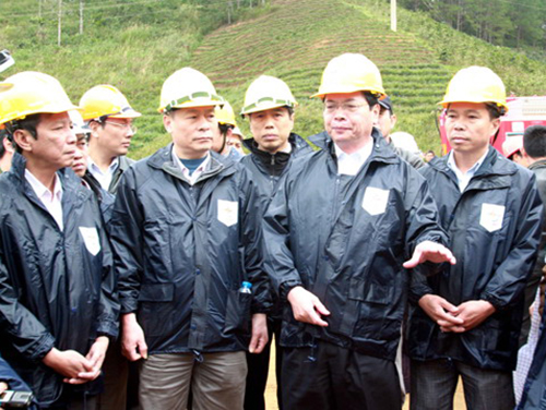 | Bộ trưởng Vũ Huy Hoàng (thứ 2 từ phải sang) chỉ đạo công tác cứu hộ tại vụ sập hầm thủy điện Đạ Dâng |