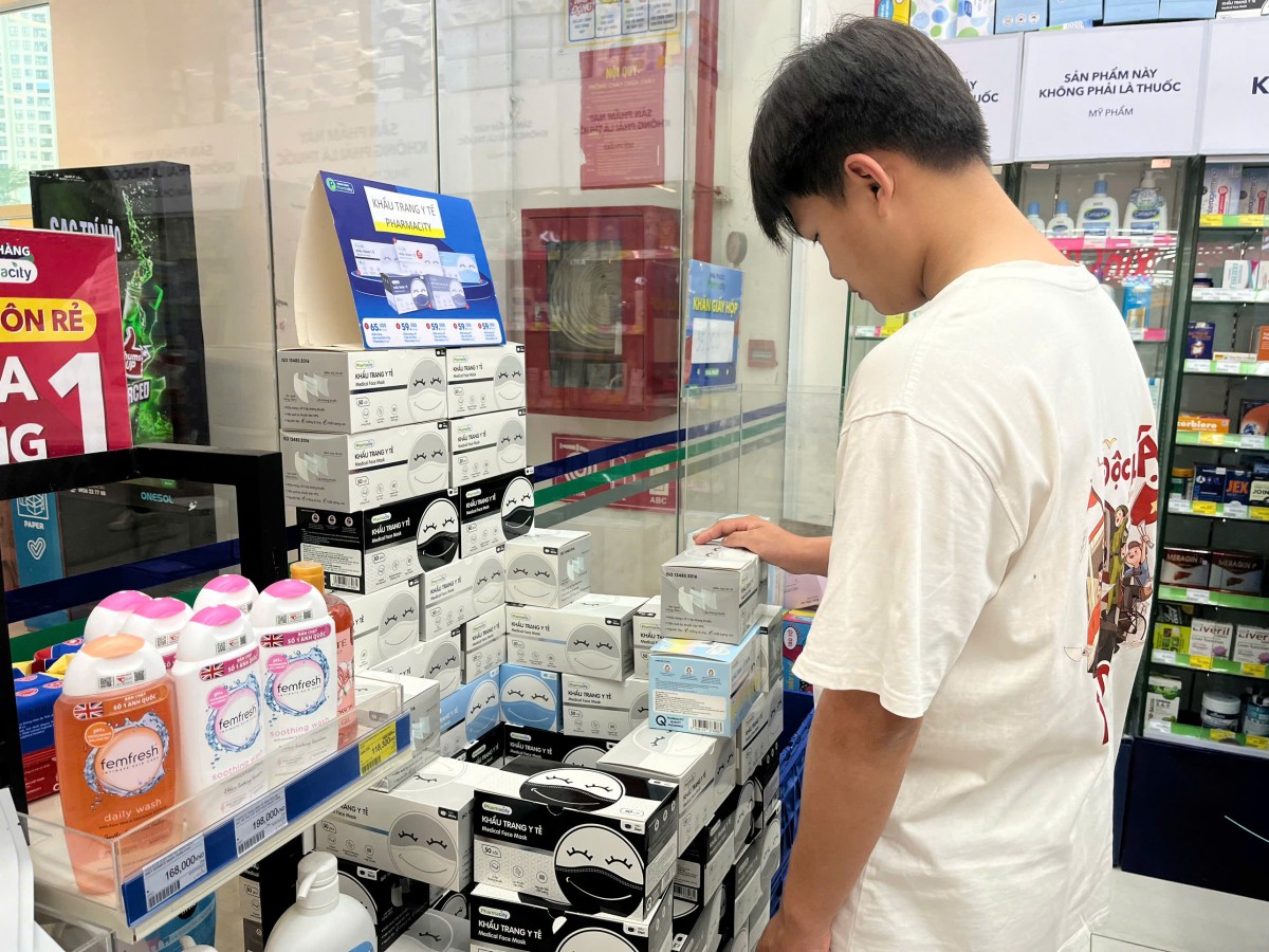 | Khách hàng mua khẩu trang tại quầy thuốc Pharmacity tại tòa nhà Go! Thăng Long. (Ảnh: Phương Cúc) |
