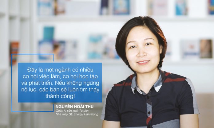 Là Quản lý sản xuất Tủ điện tại nhà máy GE Energy Hải Phòng, giờ làm việc của chị Nguyễn Hoài Thu dường như không cố định. Làm sản xuất, thứ thường trực trên tay chị là chiếc điện thoại và thường trực trong đầu là công việc. “Vì thế, đôi khi tôi không còn thời gian cho con cái. Nhiều người nói rằng việc kỹ thuật khó và áp lực cho phụ nữ nhưng thật ra, việc phải ‘đội trên đầu nhiều cái mũ cùng lúc’ – vừa làm việc, vừa làm vợ, làm mẹ – mới chính là áp lực mà phụ nữ chúng tôi phải chịu,” chị nói.