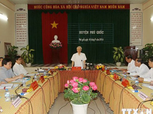 Làm việc với cán bộ chủ chốt của huyện Phú Quốc, Tổng Bí thư chỉ rõ, trước mắt, Phú Quốc, Kiên Giang cần tập trung thực hiện đồng thời 2 nhiệm vụ lớn: Tiếp tục chỉ đạo thực hiện quyết liệt, dồn sức hoàn thành các chỉ tiêu nhiệm vụ đã đề ra trong nhiệm kỳ 2011-2015; chuẩn bị thật tốt cho Đại hội Đảng các cấp nhiệm kỳ tới.