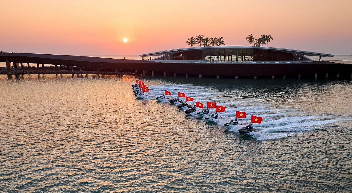 Một trong những tiết mục nhận được pháo tay nhiều nhất là diễu hành cờ Tổ quốc bằng Jetski. 15 motor mang theo cờ đỏ sao vàng tung bay giữa biển trời hoàng hôn khiến ai nấy không khỏi xúc động và tự hào.