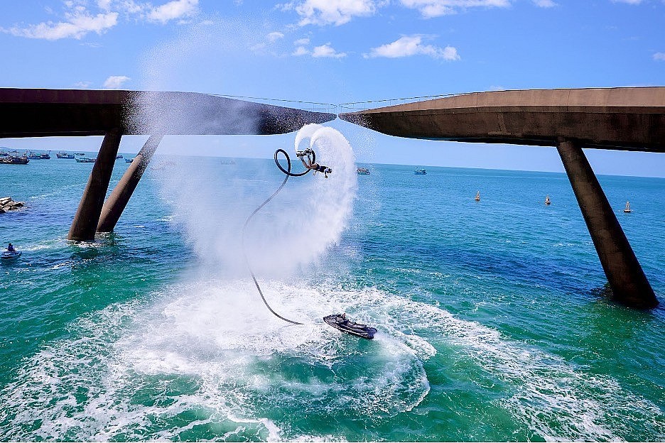 Trong ráng chiều tuyệt mỹ của nam đảo, đông đảo du khách từ Cầu Hôn và bãi biển được “chiêu đãi” màn vẽ hoa trên sóng nước của 18 vận động viên quốc tế với Jetski (moto nước) và flyboard (ván đứng nước phản lực).