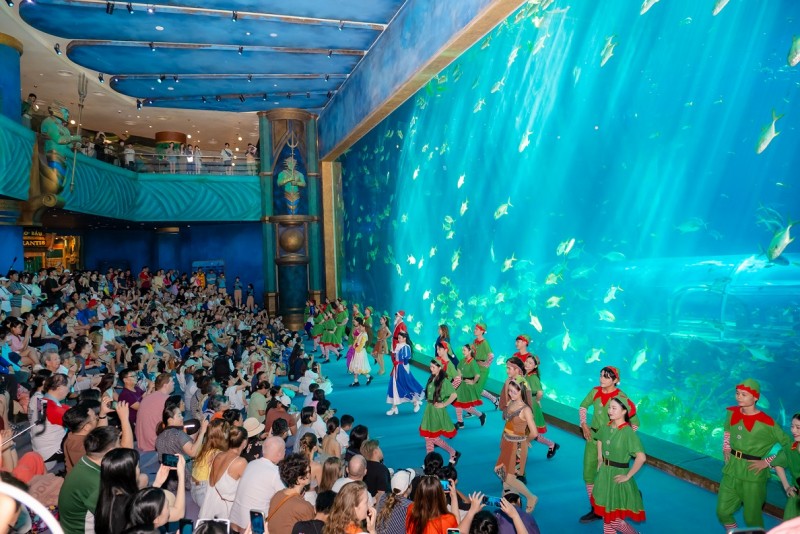 Thủy cung hình rùa lớn nhất thế giới thu hút đông đảo “nhà thám hiểm đại dương” đến chiêm ngưỡng hàng trăm nghìn sinh vật biển. Du khách đều choáng ngợp khi đứng giữa những loài cá khổng lồ bơi lượn trong bể thủy cung lớn top 5 thế giới, hay dạo bước trong thế giới sứa lung linh ảo diệu. Show diễn Nàng tiên cá phiên bản đặc biệt trên nền nhạc Maroon 5 khuấy động không khí 8Wonder trước giờ G, hấp dẫn nhiều fan nhún nhảy theo điệu nhạc giữa lòng đại dương xanh thẳm.