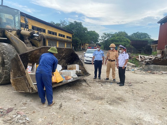 | Lực lượng chức năng tiêu hủy 250 kg nội tạng động vật là lòng, gan, phổi trâu, bò, lợn các loại không đảm bảo an toàn thực phẩm. (Ảnh: Tổng cục Quản lý thị trường) |