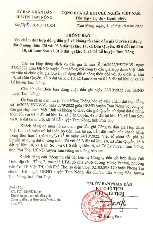 Ngày 24/10, UBND huyện Tam Nông đã có Thông báo số 2495/UBND-TCKH, về việc chấm dứt hợp đồng đấu giá đối với Công ty Đấu giá hợp danh Việt Linh và không tổ chức đấu giá quyền sử dụng 52 thửa đất nói trên.
