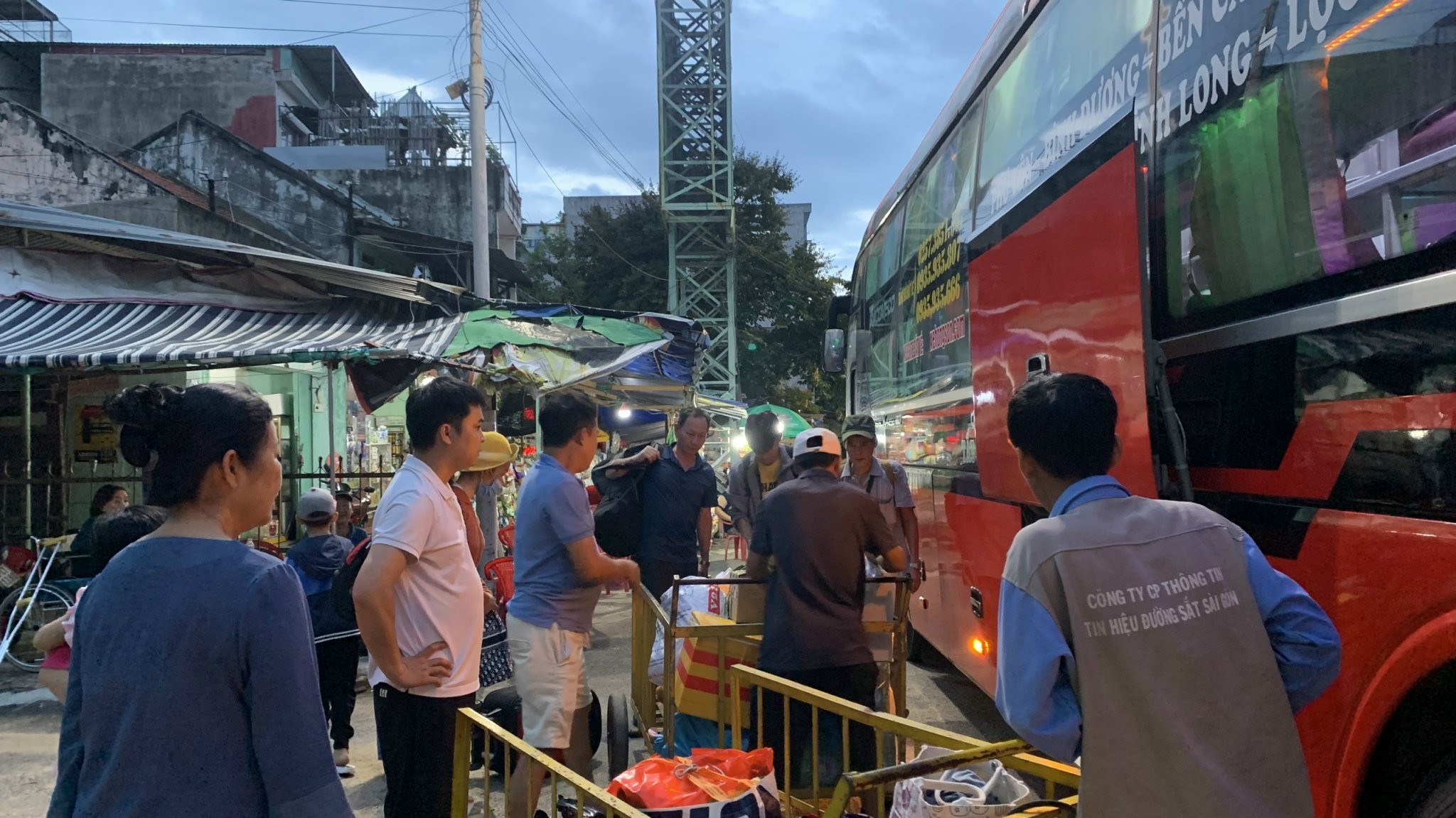 | Hành khách ở ga Tuy Hòa lên xe trung chuyển qua ga La Hai do sự cố, chiều 21/5. Ảnh: Minh Toàn |