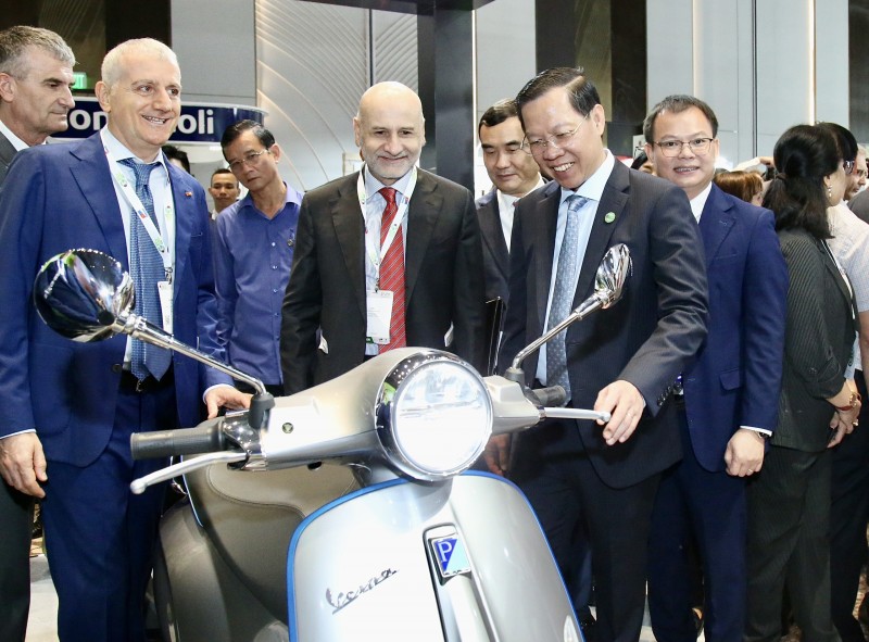 | Chủ tịch UBND TP. Hồ Chí Minh Phan Văn Mãi thăm gian hàng PIAGGIO sáng 28/11. |
