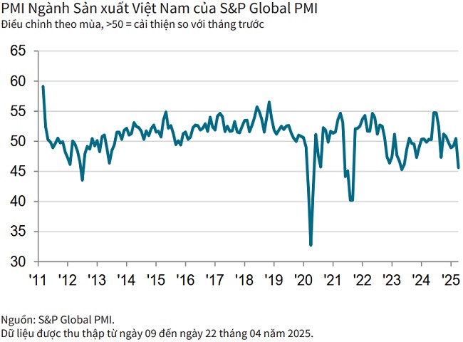 Sau ba tháng liên tiếp giằng co quanh mốc 50 điểm, chỉ số PMI ngành sản xuất Việt Nam đã “rơi” mạnh từ 50,5 điểm trong tháng 3 xuống chỉ còn 45,6 điểm trong tháng 4/2025.