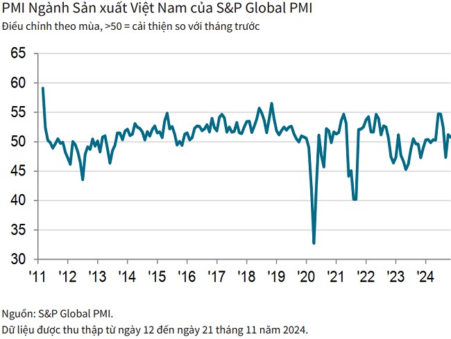 Chỉ số Nhà quản trị mua hàng (PMI) ngành sản xuất Việt Nam tiếp tục ở trên ngưỡng 50 điểm trong tháng 11, từ đó cho thấy các điều kiện kinh doanh đã cải thiện tháng thứ hai liên tiếp sau khi suy giảm do cơ bão Yagi trong tháng 9.