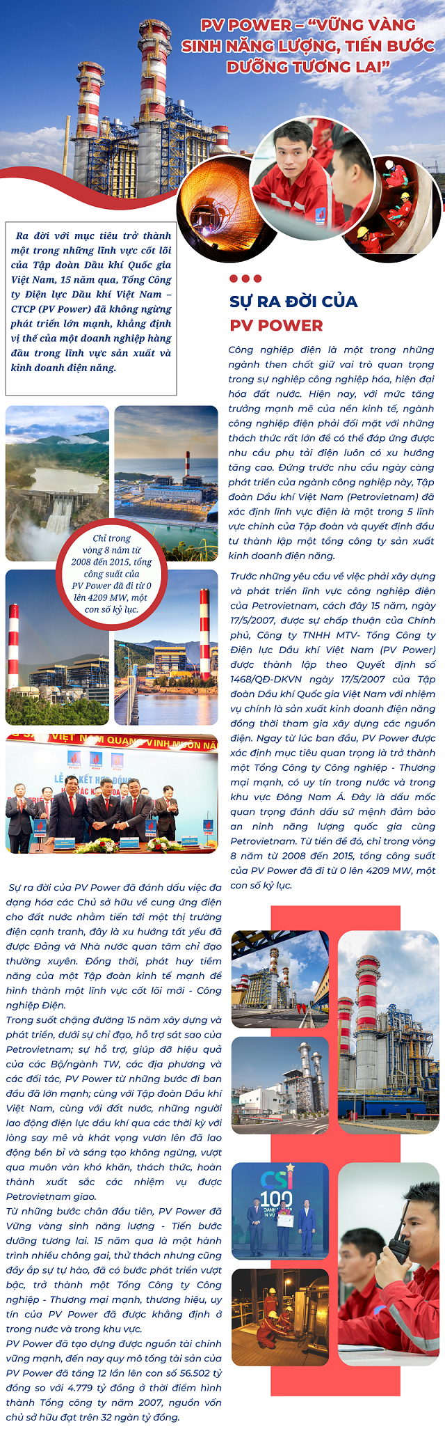 Ra đời với mục tiêu trở thành một trong những lĩnh vực cốt lõi của Tập đoàn Dầu khí Quốc gia Việt Nam, 15 năm qua, Tổng Công ty Điện lực Dầu khí Việt Nam - CTCP (PV Power) đã không ngừng phát triển lớn mạnh, khẳng định vị thế của một doanh nghiệp hàng đầu trong lĩnh vực sản xuất và kinh doanh điện năng.