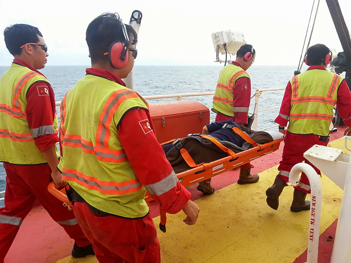 Qua đánh giá tình trạng của nạn nhân với vết thương sâu, dài ở phía bụng dưới, bụng và xung quanh vùng bị thương của bệnh nhân có dấu hiệu dập nát, mất nhiều máu, lo ngại có thể tổn thương nội tạng. Kết quả khám của Bác sỹ trực tại tàu FPSO cho thấy bệnh nhân cần được đưa vào đất liền để can thiệp y tế sớm nhất. Nhận định tình hình không thể dùng tàu cá hay tàu dịch vụ đưa nạn nhân về bờ, vì sẽ mất thời gian khoảng 24h, qua trao đổi, thống nhất, Ban An toàn Sức khỏe Môi trường - PVEP đã thống nhất với PVEP POC yêu cầu Nhà thầu MODEC – đơn vị quản lý tàu FPSO tiến hành thông báo và xác nhận dịch vụ cứu hộ y tế (MEDIVAC) bằng trực thăng do tổ chức SOS quốc tế tại Việt Nam thực hiện, với mục tiêu thời gian tiến hành nhanh nhất, đảm bảo an toàn tính mạng cho ngư dân bị tai nạn. Mọi chi phí liên quan đến chuyến bay MEDIVAC và các dịch vụ y tế cứu hộ đều do PVEP POC chi trả.