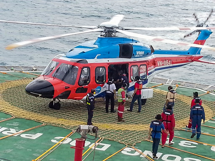 | Vận chuyển nạn nhân từ mỏ Sông Đốc về đất liền bằng trực thăng |
