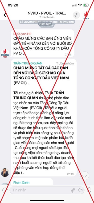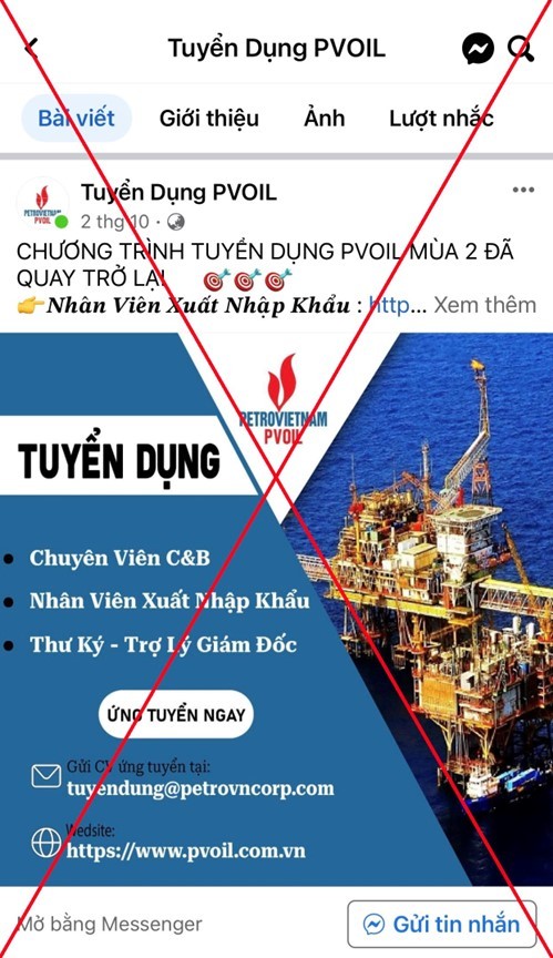 | PVOL đã đưa ra cảnh báo về nhiều fanpage giả mạo tuyển dụng để lừa đảo - Ảnh: PVOIL |