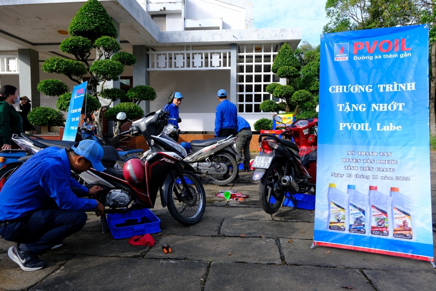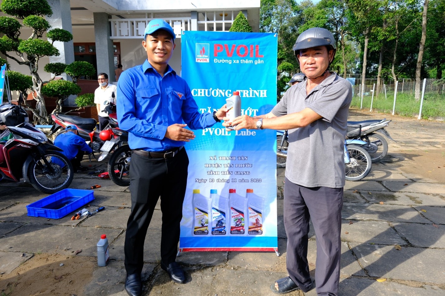 Ngoài ra, 100 sản phẩm dầu nhờn PVOIL Lube cũng được gửi tặng đến người dân huyện Tân Phước qua chương trình thay nhớt xe miễn phí do đoàn viên thanh niên PVOIL thực hiện.