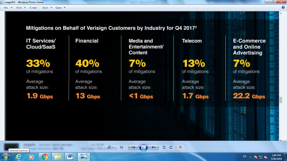 Key DDoS trends and observations: 42 percent of DDoS attacks were User Datagram Protocol (UDP) floods; 82 percent of DDoS attacks mitigated by Verisign in Q4 2017 employed multiple attack types. The Financial industry, representing 40 percent of mitigation activity, was the most frequently targeted industry for Q4 2017. The IT/Cloud/SaaS industry, previously the most targeted industry, experienced the second highest number of DDoS attacks, representing 33 percent of mitigation activity.
