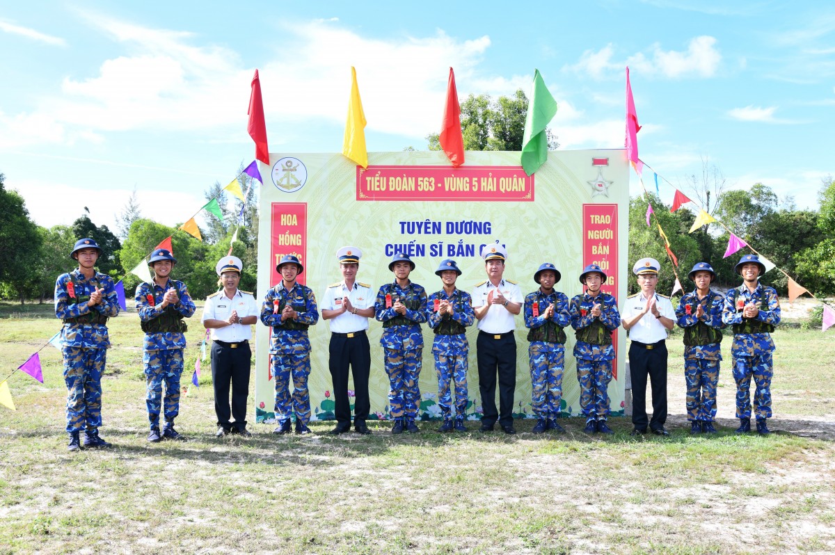 | Đại tá Nguyễn Quốc Doanh và thủ trưởng Bộ Tư lệnh Vùng 5 Hải quân tặng hoa các chiến sĩ Tiểu đoàn 563 đạt thành tích bắn giỏi |