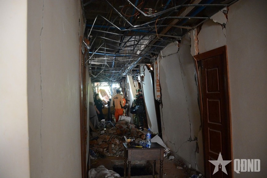 | Lực lượng cứu hộ tạo một lỗ thoát tại vị trí nạn nhân bị mắc kẹt. (Ảnh: QĐND) |