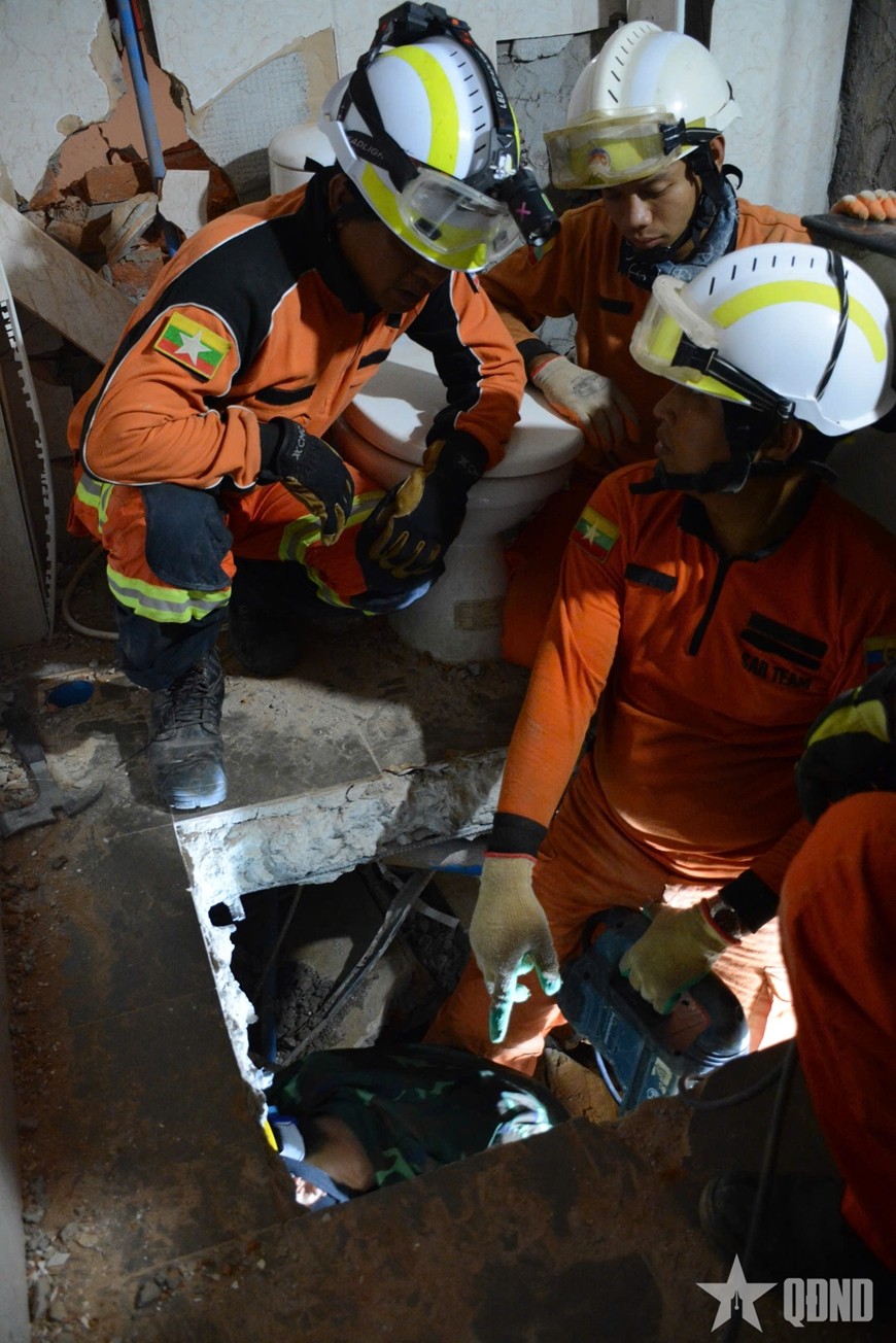 Trưa 2/4, khi đang triển khai công tác cứu hộ tại Bệnh viện Ottara Thiri ở thủ đô Naypyidaw của Myanmar, đoàn cứu hộ Quân đội nhân dân (QĐND) Việt Nam nhận được thông tin một nạn nhân động đất mắc kẹt trong đống đổ nát nhưng vẫn còn sống.