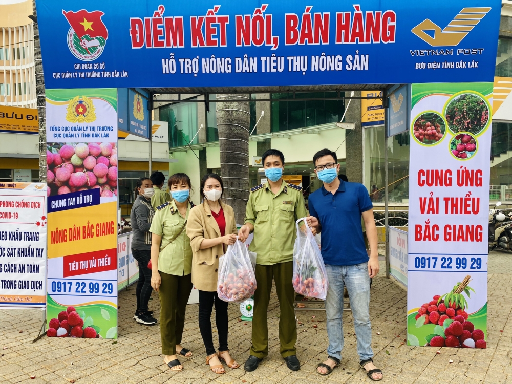 Cục trưởng Cục Quản lý thị trường Đắk Lắk cho biết, ngày 12/6, 30 tấn vải thiều Bắc Giang đầu tiên được vận chuyển về tỉnh Đắk Lắk và đã được Cục Quản lý thị trường phối hợp với Bưu điện tỉnh kết nối tiêu thụ thành công. Số lượng vải thiều đa số được tiêu thụ theo hình thức kết nối với các siêu thị, cửa hàng lớn, chợ đầu mối và các thương nhân phân phối nông sản. Số ít còn lại đã được Chi đoàn thanh niên Cục Quản lý thị trường và Chi đoàn thanh niên Bưu điện tỉnh tổ chức bán lưu động tại điểm bán Trung tâm Ngã Sáu thành phố Buôn Ma Thuột. Tất cả hình thức tiêu thụ đều đảm bảo các biện pháp an toàn trong công tác phòng, chống dịch bệnh.