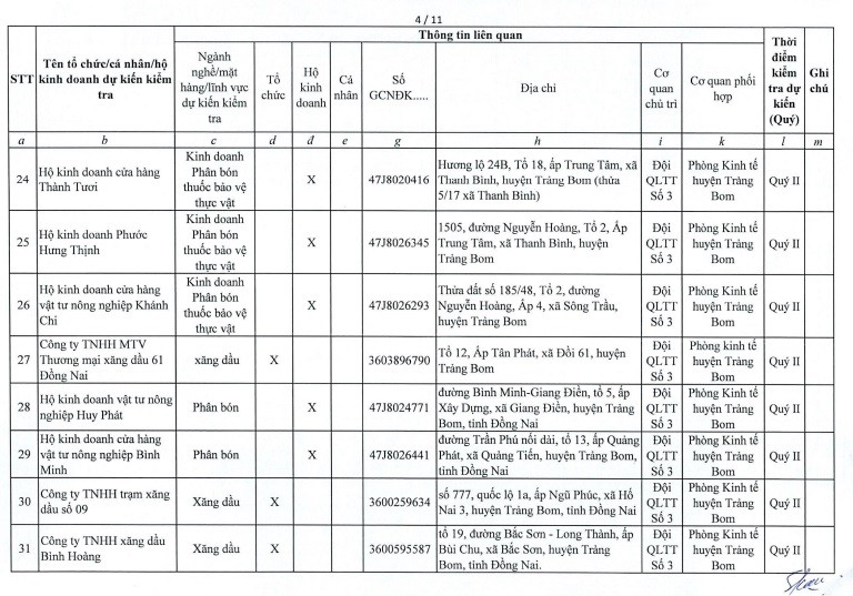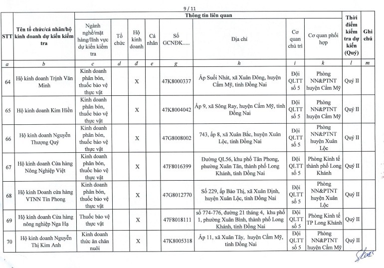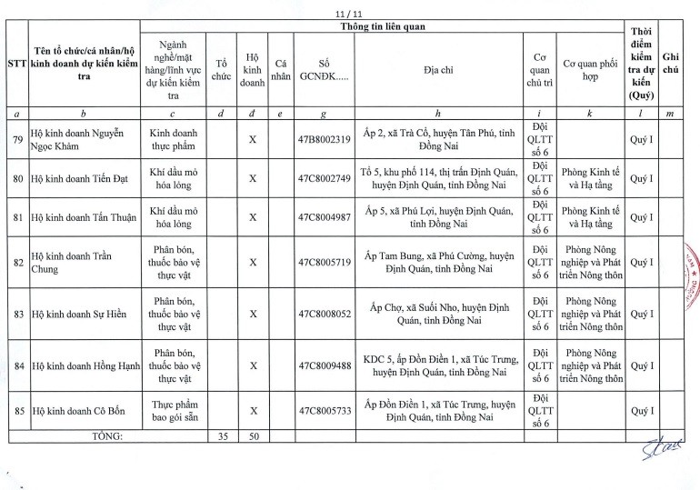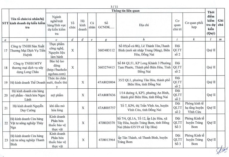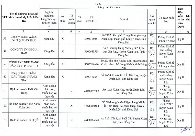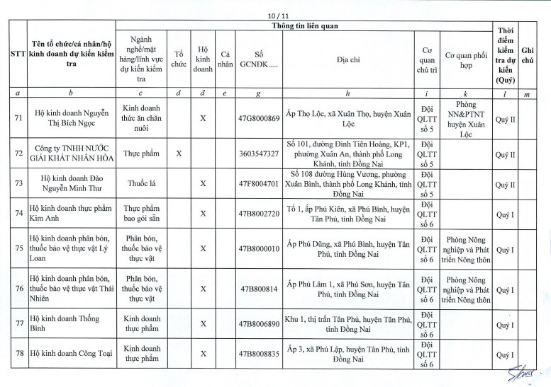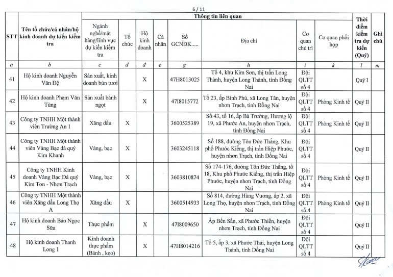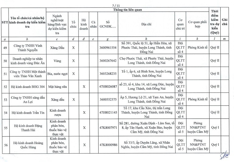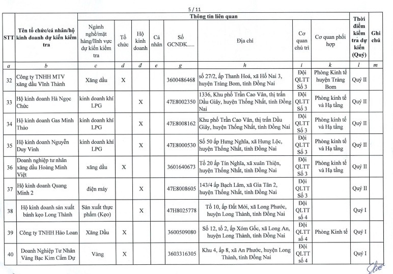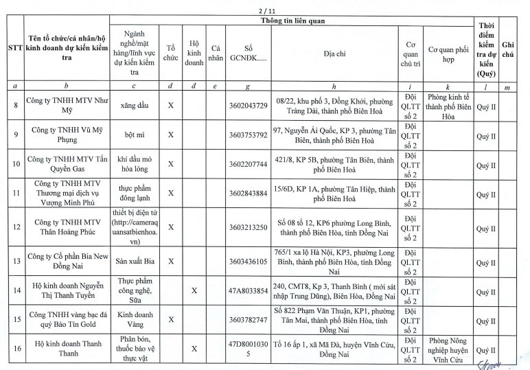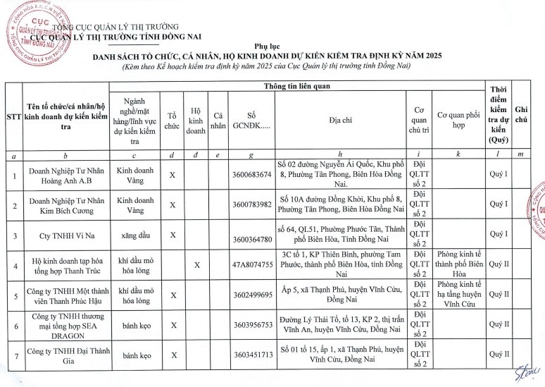 Theo đó, năm 2025, Cục Quản lý thị trường tỉnh Đồng Nai sẽ kiểm tra đối với 40 tổ chức, cá nhân là các đơn vị hoạt động kinh doanh xăng dầu; kinh doanh rượu; kinh doanh các sản phẩm thuốc lá, thuốc lá điện tử; kinh doanh hàng điện tử; hoạt động kinh doanh các nhóm sản phẩm thực phẩm thuộc phạm vi quản lý của Bộ Công Thương; kinh doanh mặt hàng phân bón, thuốc bảo vệ thực vật, thức ăn chăn nuôi, thức ăn thủy sản, thời trang, mỹ phẩm, vàng; kinh doanh khí; kinh doanh mặt hàng đường cát.