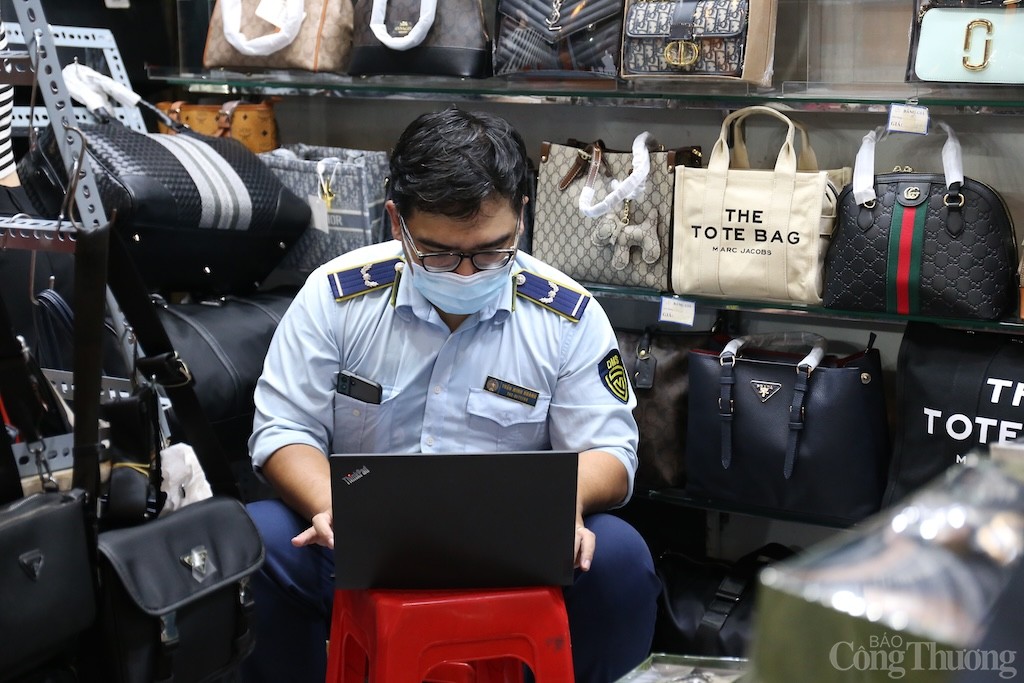 | Lực lượng Quản lý thị trường thu thập dữ liệu số hàng hoá có dấu hiệu vị phạm tại chợ Bến Thành. Ảnh: Sỹ Đồng |
