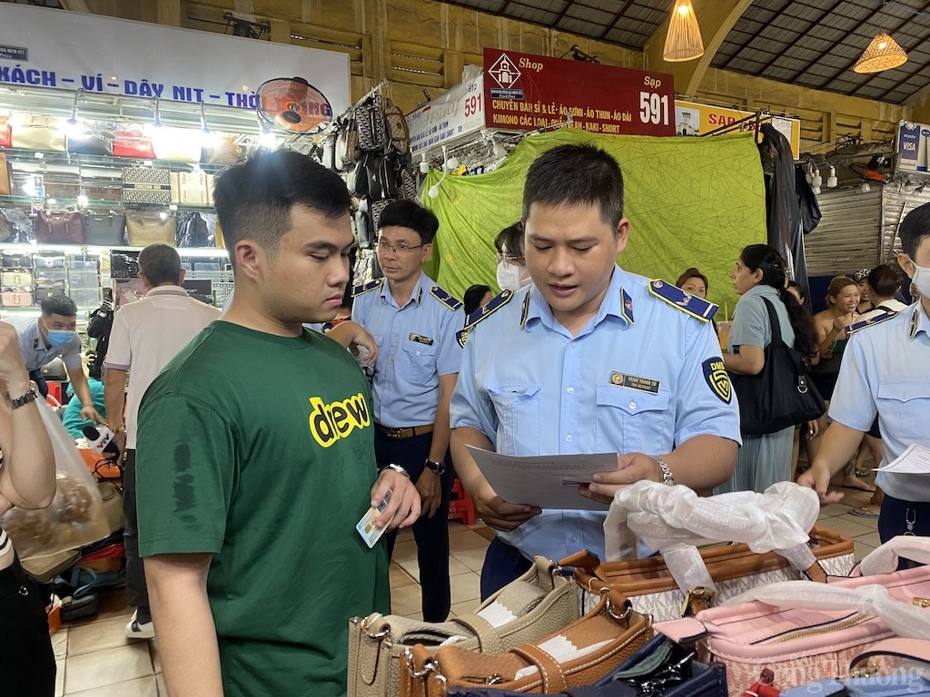 | Lực lượng Quản lý thị trường kiểm tra giấy phép kinh doanh của một cơ sở kinh doanh túi xách tại chợ Bến Thành. Ảnh: Sỹ Đồng |