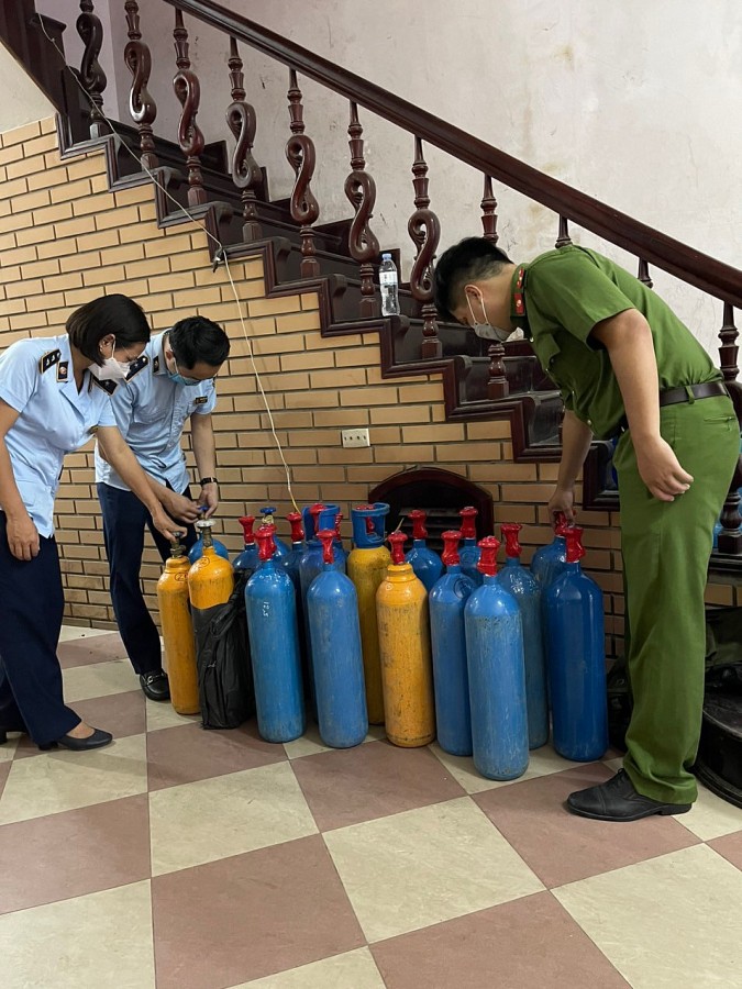 Tại thời điểm kiểm tra, Đoàn kiểm tra phát hiện tại địa chỉ trên đang tập kết lô hàng hoá gồm 22 bình kim loại (bên trong mỗi bình chứa từ 4 đến 4,5 kg khí N2O), trên vỏ bình không có thông tin về nơi sản xuất, xuất xứ.