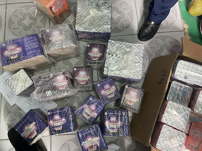 Tại hiện trường, các lực lượng chức năng kiểm đếm được 1.459 ống pháo hoa với nhiều kích cỡ được đóng trong các hộp và giàn phóng, tất cả đều không có hoá đơn chứng từ.