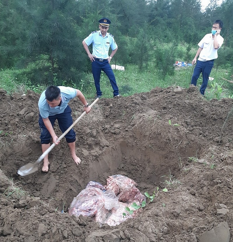 | Lực lượng chức năng tổ chức năng tổ chức tiêu hủy 600 kg cổ cánh gà. Ảnh : Cục QLTT Nghệ An |