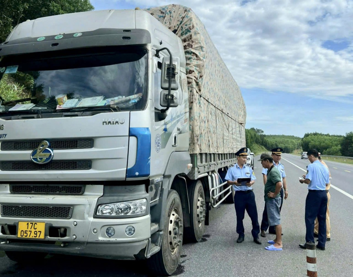 | Phối hợp với các lực lượng chức năng tỉnh Thừa Thiên Huế kiểm tra các phương tiện vận tải có dấu hiệu vi phạm. Ảnh Cục QLTT TTH |