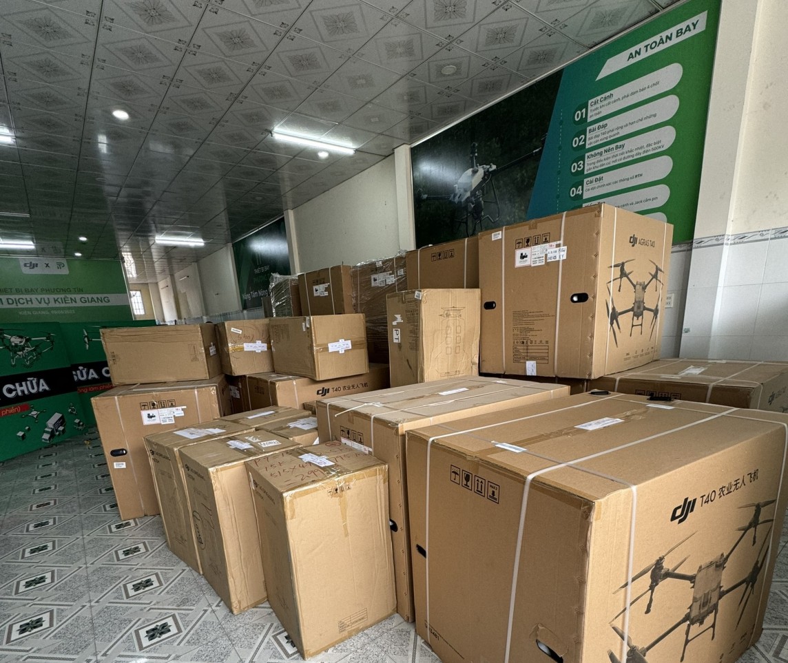 | Lô hàng gồn hơn 36 thiết bị bay và bình rải chứa phân bón không có nhãn phụ tiếng Việt. |