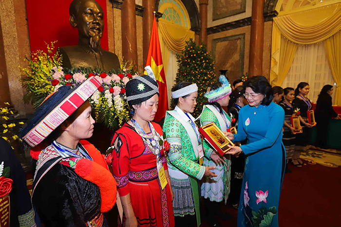 | Phó Chủ tịch nước Đặng Thị Ngọc Thịnh chúc mừng các cô đỡ thôn bản tiêu biểu |