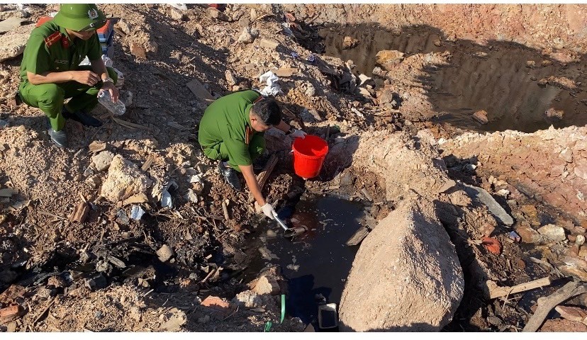 Tại hiện trường, Phòng Cảnh sát môi trường đã lập biên bản kiểm tra và tiến hành lấy mẫu nước thải để phân tích kiểm nghiệm.