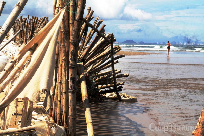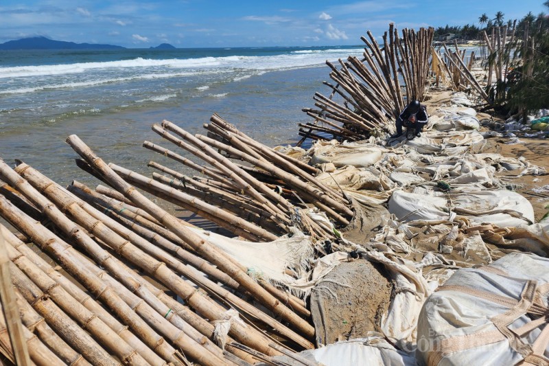 | Kè tạm chống sạt lở là những cây tre do người dân tạo ra bị sóng đánh gãy |