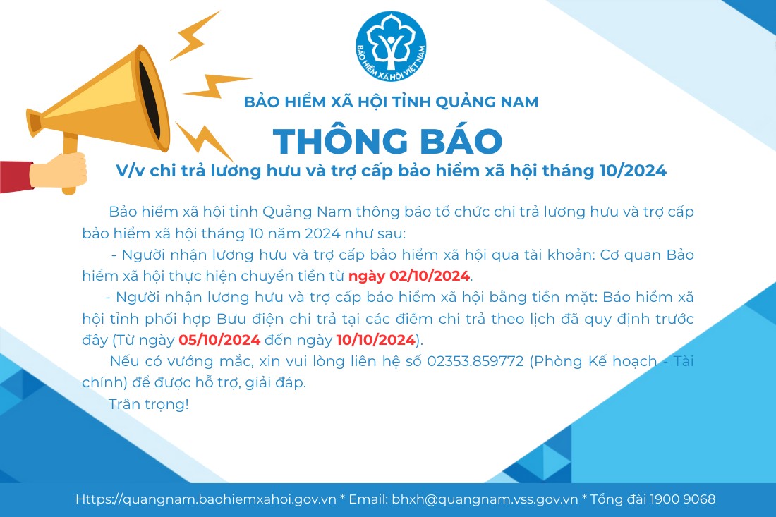Chiều tối ngày 1/10, Bảo hiểm Xã hội tỉnh Quảng Nam có thông báo, người nhận lương hưu và trợ cấp bảo hiểm xã hội qua tài khoản, cơ quan bảo hiểm xã hội thực hiện chuyển tiền từ ngày 2/10/2024.