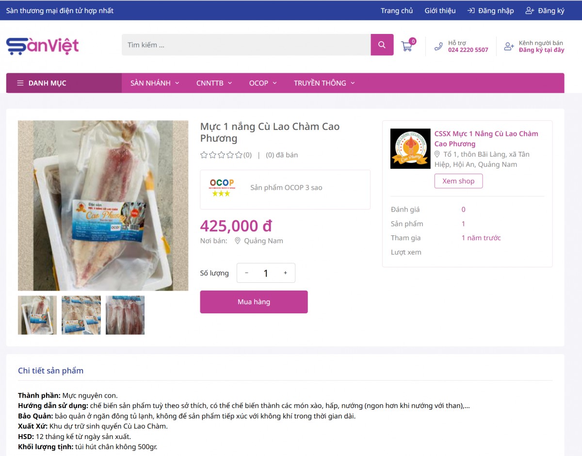 Sàn Việt là một kênh phân phối, quảng bá hữu hiệu cho sản phẩm OCOP tỉnh Quảng Nam, trong đó có mực một nắng Cù Lao Chàm. (Ảnh chụp màn hình)