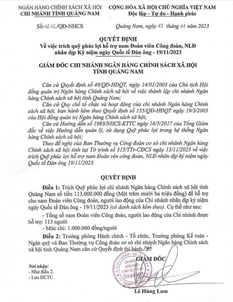 Ngày 19/11, lãnh đạo Chi nhánh Ngân hàng Chính sách xã hội tỉnh Quảng Nam xác nhận đã có quyết định về việc trích quỹ phúc lợi hỗ trợ nam đoàn viên công đoàn, người lao động nhân dịp Ngày Quốc tế Đàn ông (19/11/2023).