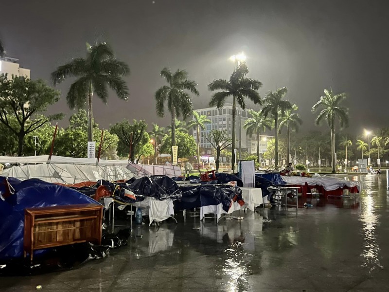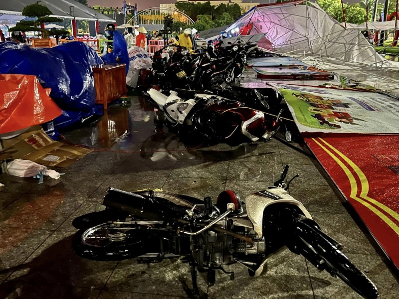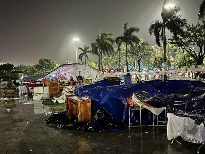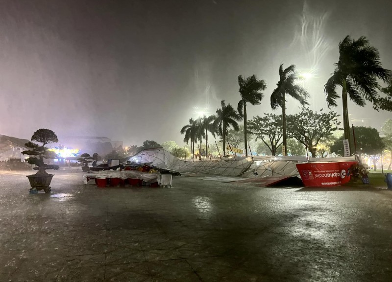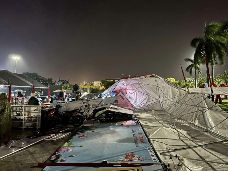 | Mưa lớn kèm gió giật mạnh khiến các gian hàng trưng bày đổ sập |