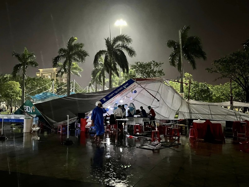 Theo đó, trận mưa đá dữ dội kéo dài kèm theo gió giật khiến nhiều mái che các gian hàng trưng bày đặt tại Quảng trường 24/3 (thành phố Tam Kỳ, tỉnh Quảng Nam) bị đổ sập, rất may không có thiệt hại về người.
