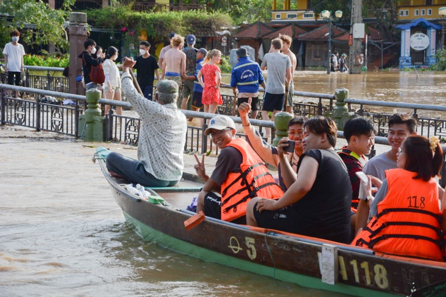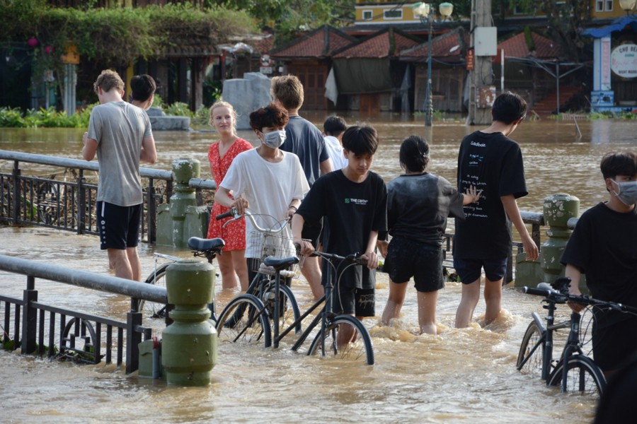 Khách du lịch thích thú khi trải nghiệm cảnh ngập lụt tại phố cổ Hội An |
