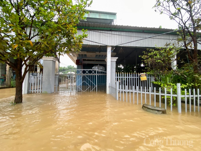 Nước tràn vào nhà dân trên đường Huỳnh Ngọc Huệ, thị trấn Ái Nghĩa |