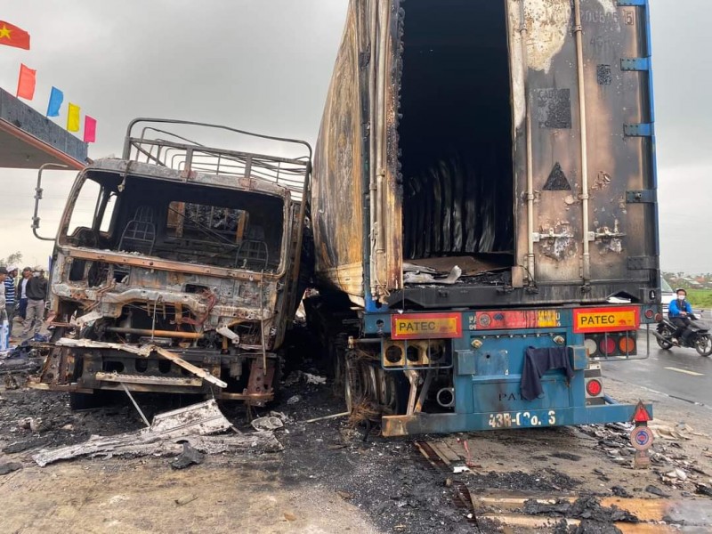 Vụ cháy khiến xe tải và hàng hoá trên xe bị thiêu rụi, xe đầu kéo bị cháy phần đầu, rất may không có thiệt hại về người.