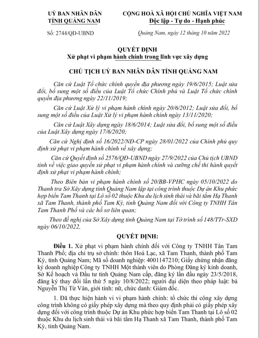 Công ty có người đại diện theo pháp luật là bà Nguyễn Thị Từ Vân - Giám đốc Công ty. Công ty bị xử phạt vì đã vi phạm hành chính, tổ chức thi công xây dựng công trình không có Giấy phép xây dựng đối với công trình thuộc Dự án Khu phức hợp biển Tam Thanh tại Lô số 02 thuộc Khu du lịch sinh thái và bãi tắm Hạ Thanh xã Tam Thanh, thành phố Tam Kỳ, tỉnh Quảng Nam.