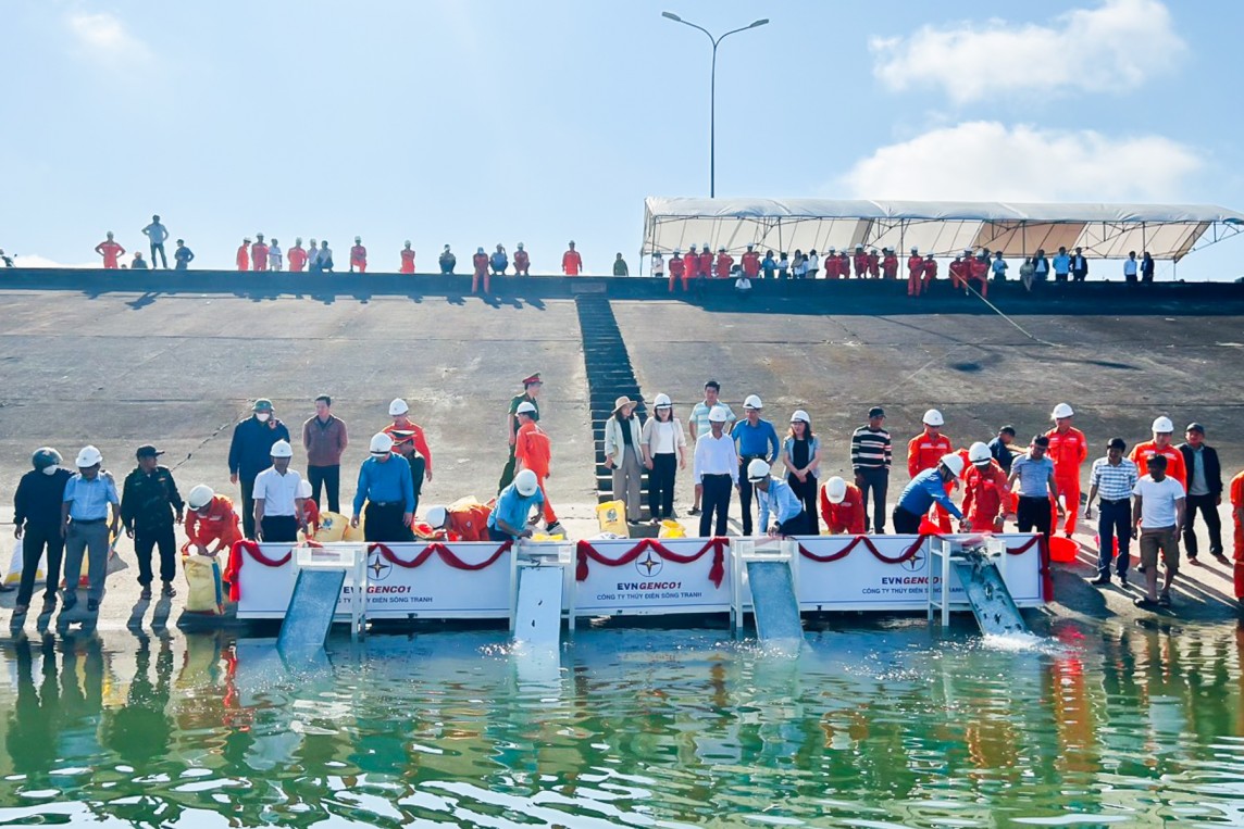 | Đợt này, Công ty Thủy điện Sông Tranh tổ chức thả 100.000 con cá giống xuống lòng hồ. |
